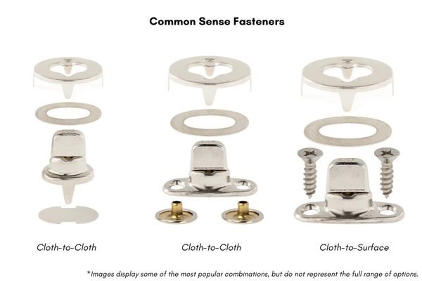 These fasteners work well on both hard and soft surfaces and are often found on dodgers, boom covers, awnings, tarps, and even bags and purses. For clean, professional installation, use the Common Sense Hand Punch which creates perfectly aligned holes for the eyelet to fit into.