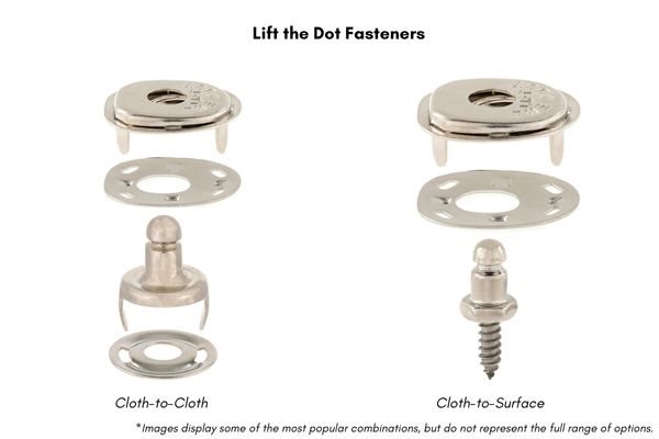 For heavy-duty applications, Lift-the-DOT fasteners provide serious holding power. They lock securely on three sides and open only by lifting the fourth, which makes them both strong and tamper-resistant. Constructed from brass and other non-corrosive metals, these fasteners are ideal for marine settings where exposure to salt and moisture is a constant challenge. They're a favorite for boat covers, side curtains, and other demanding fabric projects.