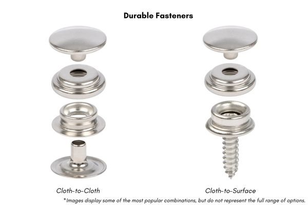 Durable Fasteners, also known simply as Snap Fasteners, are essential for canvas and marine applications. A complete snap set includes four parts: the button, socket, eyelet, and stud. In cloth-to-cloth installations, all four are used—two parts on each side. For cloth-to-surface applications, the stud is usually mounted directly to a hard surface using a screw, or you can opt for a screw stud with a built-in screw, eliminating the need for an eyelet.