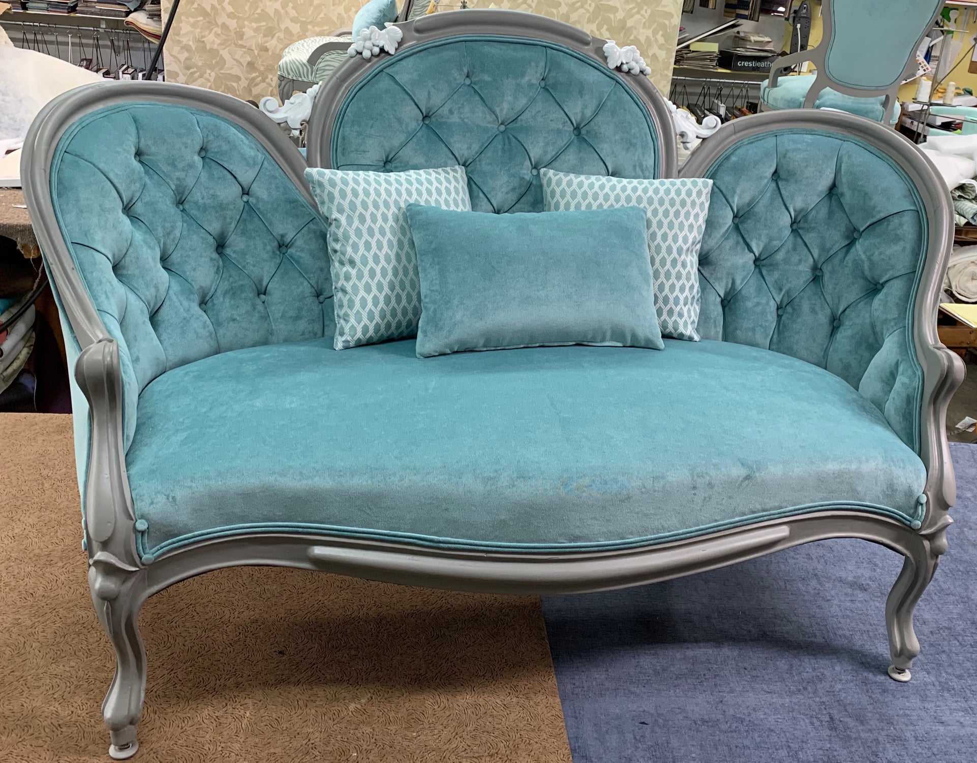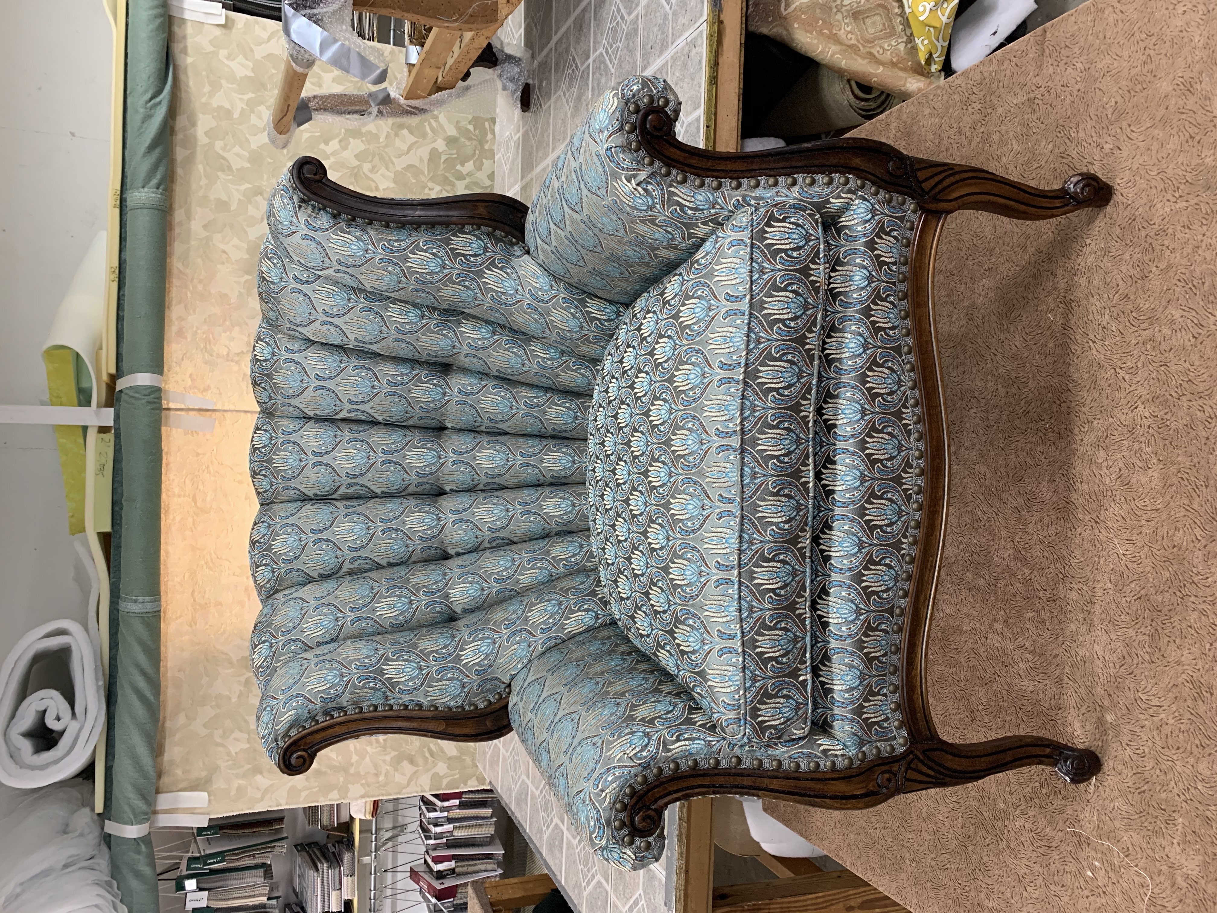 That’s so hard to say! I’ve done so many that I really loved. One that comes to mind is a two piece section with wide channels and a show wood top, bottom, and arms that required head to head decorative nails. The owner chose a beautiful multi-colored damask that happened to be in my favorite colors. Plus, I love doing decorative nails – I find it relaxing getting to set each nail!
